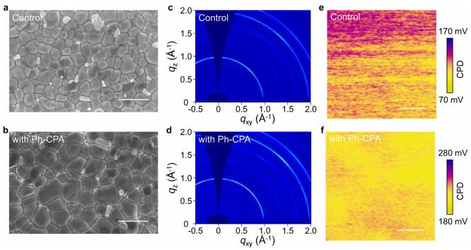 圖1 FA0.95Cs0.05PbI3薄膜的形貌和結(jié)晶性。(a)對(duì)照組和(b)添加 Ph-CPA 的鈣鈦礦薄膜的俯視掃描電子顯微鏡(SEM)圖像(標(biāo)尺為 1 微米)。(c)對(duì)照組和(d)添加 Ph-CPA 的鈣鈦礦薄膜的掠入射廣角 X 射線散射(GIWAXS)圖樣。(e)對(duì)照組和(f)添加 Ph-CPA 的鈣鈦礦薄膜的表面電勢(shì)分布(標(biāo)尺為 500 納米)。CPD代表接觸電位差。