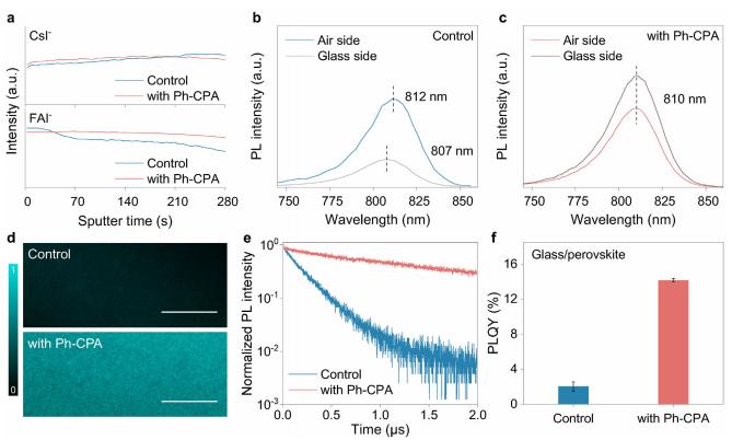 圖1 FA-Cs分布與光電特性:(a)有無摻入 Ph-CPA 的 FA0.95Cs0.05PbI? 鈣鈦礦薄膜中陽離子的分布情況,樣品結(jié)構(gòu)為玻璃 / ITO/FA0.95Cs0.05PbI?。(b)對(duì)照組和(c)添加 Ph-CPA 的鈣鈦礦薄膜從空氣側(cè)和玻璃側(cè)測(cè)得的光致發(fā)光(PL)光譜。(d)共聚焦激光掃描顯微鏡(CLSM)成像圖(標(biāo)尺為 50 微米)。(e)時(shí)間分辨光致發(fā)光(TRPL)衰減光譜以及(f)對(duì)照組和添加 Ph-CPA 的鈣鈦礦薄膜的光致發(fā)光量子產(chǎn)率(PLQY)。