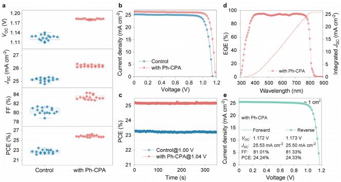 圖2 基于FA0.95Cs0.05PbI?的鈣鈦礦太陽能電池(PSC)的光伏性能。(a)有無添加Ph-CPA的16個(gè)獨(dú)立器件(孔徑面積:0.08平方厘米)的器件性能參數(shù)值(VOC、JSC、FF和PCE)。(b)有無添加Ph-CPA的*佳性能器件在反向掃描時(shí)的J–V曲線。(c)在模擬AM1.5陽光下,有無添加Ph-CPA的器件在接近*大功率點(diǎn)(MPP)偏壓下的穩(wěn)定功率輸出。(d)添加Ph-CPA的*佳性能器件的EQE光譜和積分JSC。(e)添加Ph-CPA的*佳性能1.01平方厘米器件在不同掃描方向上的J–V曲線。