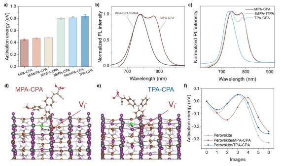 圖2 (a)在不同HSMs上沉積的鈣鈦礦薄膜中PIHS的活化能。(b)在MPA-CPA或MPA-CPA/PMMA上沉積的鈣鈦礦在光照20分鐘后的歸一化PL強(qiáng)度。(c)在MPA-CPA和TPA-CPA混合HSMs上沉積的1.76 eV鈣鈦礦薄膜在光照20分鐘后的PL光譜。(d)MPA-CPA/鈣鈦礦模型和(e)TPA-CPA/鈣鈦礦模型中包含鹵素空位(VI?)的初始界面結(jié)構(gòu),分子的MeO基團(tuán)在表面頂部上方1.554 Å的高度。(f)DFT計算鹵素離子遷移到相鄰鹵素空位的離子擴(kuò)散活化能。