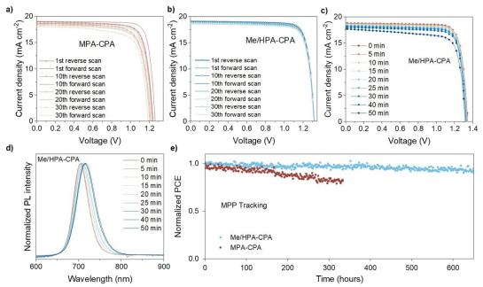 圖3 (a)和(b)基于MPA-CPA和Me/HPA-CPA的器件在0.10 V s-1掃描速率下30次正反掃描周期的J–V曲線。(c)在光照條件下(氙燈,1個太陽),基于Me/HPA-CPA的器件在50分鐘內(nèi)J–V曲線和(d)PL光譜的變化。(e)在氮?dú)鈼l件下,基于MPA-CPA和Me/HPA-CPA的寬禁帶鈣鈦礦太陽能電池(WBG-PSCs)的操作穩(wěn)定性。其中,基于MPA-CPA和Me/HPA-CPA的WBG-PSCs的初始PCE分別為18.9%和20.3%。