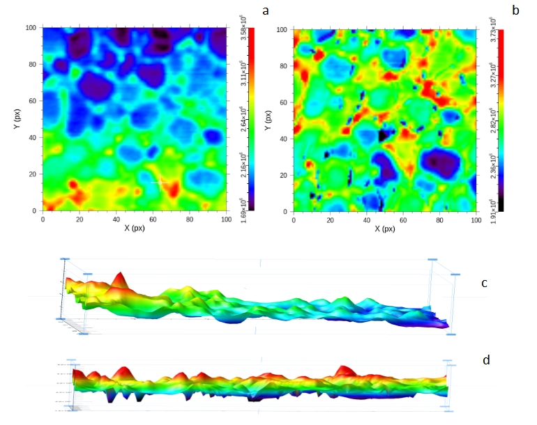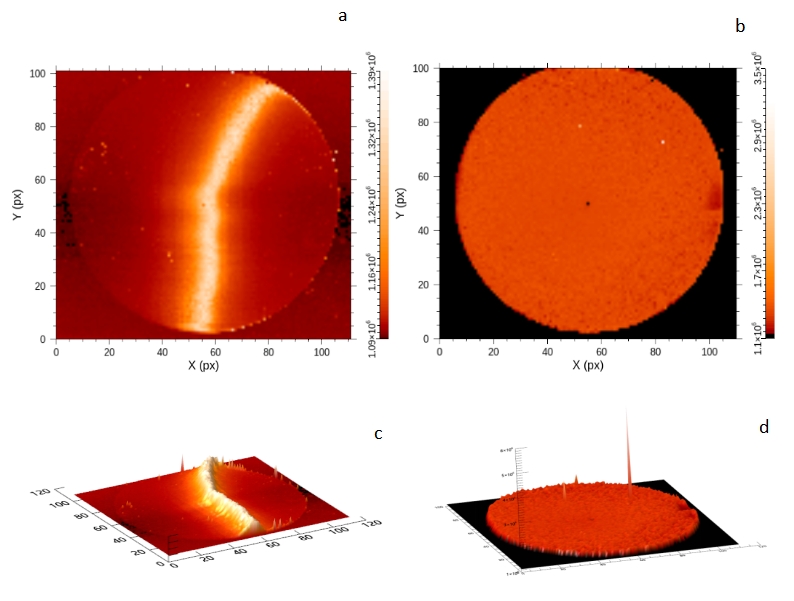 圖 先進陶瓷材料,a(非自動聚焦)b(自動聚焦)的拉曼成像平面圖;c(非自動聚焦)d(自動聚焦)的拉曼成像剖面圖
