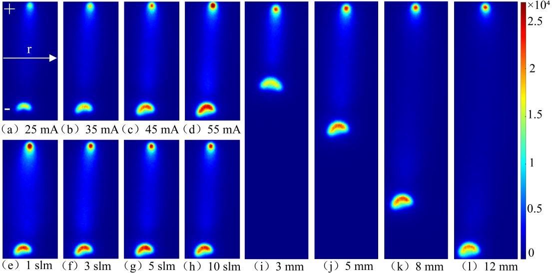 氣體流量的影響(圖1 e-h):在固定電流(45 mA)和間距(5 mm)下,氣流從1 slm增至10 slm。氣流對陽極和陰極區(qū)的等離子體形態(tài)影響明顯,尤其是在陽極附近,隨著流速增加,等離子體直徑更窄,這種現(xiàn)象可以歸因于增強(qiáng)的對流冷卻效應(yīng)。較高的氣體流量能夠更有效地帶走放電通道邊緣的熱量,抑制其徑向擴(kuò)展,從而導(dǎo)致放電通道的收縮。