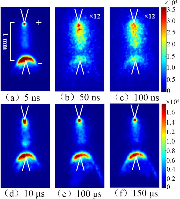 圖2: 在120 kΩ限流電阻下,門寬為2 ns(a-c)和100 ns(d-f)時(shí)拍攝的脈沖放電圖像。