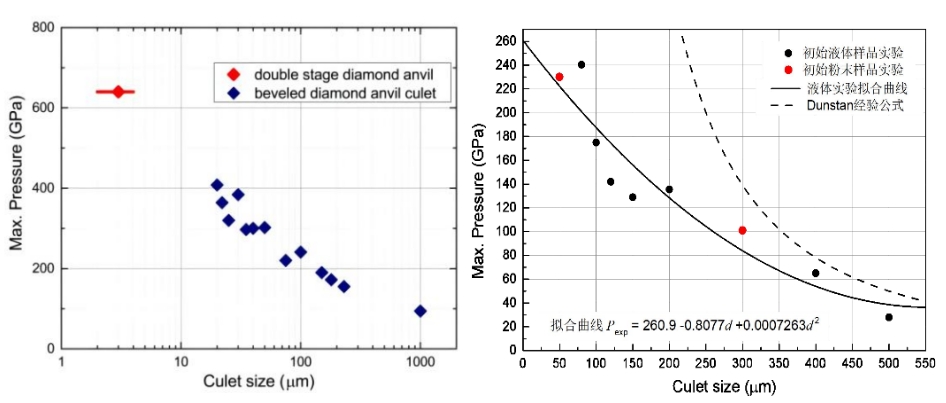 其中壓力(P)的單位為GPa,壓砧砧面直徑(d)的單位為mm。該公式為設(shè)計不同砧面尺寸的高壓實驗提供了估算依據(jù)。下圖匯總了國內(nèi)外在不同金剛石砧面直徑下所獲得的*大實驗壓力[10-24]。