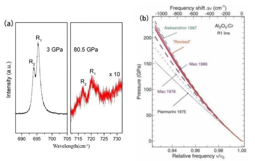圖3. (a) 3 GPa和80.5 GPa 壓力條件下紅寶石的熒光峰;(b) R1線隨壓力變化關(guān)系[25]