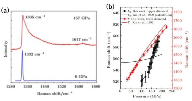 圖4. (a) 0 GPa和157 GPa條件下的壓砧金剛石拉曼峰;(b) 金剛石拉曼峰緣移動對應(yīng)金剛石布里淵中心Γ點的高壓行為[28],紅點為實驗數(shù)據(jù),紅色實線為Γ點隨壓力變化關(guān)系。