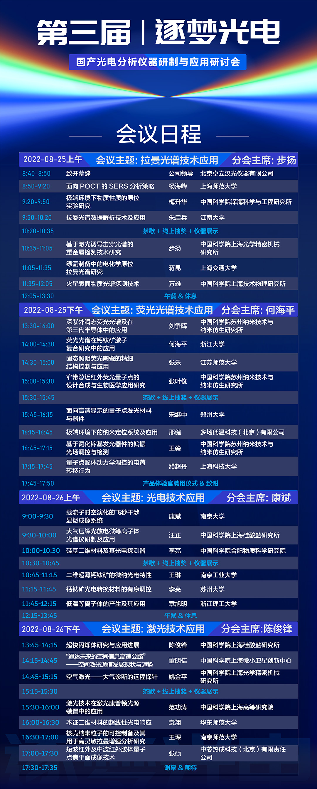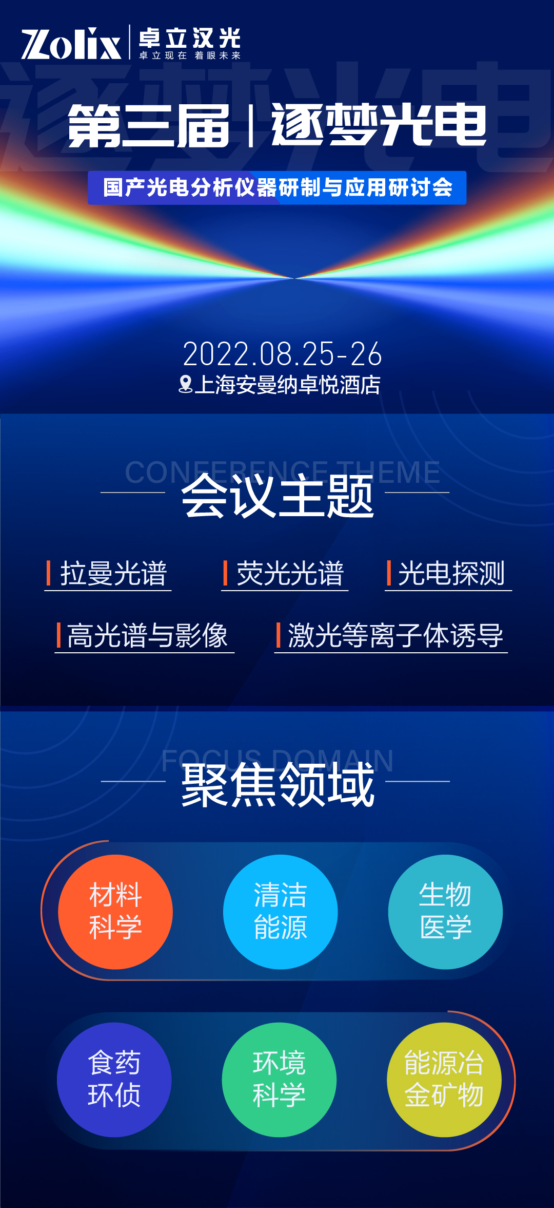 卓立漢光是專業(yè)從事光電分析測試儀器和精密光學機械運動控制產(chǎn)品研發(fā)與生產(chǎn)的國家高新技術企業(yè),秉持 “研發(fā)創(chuàng)新、快速反應、優(yōu)質服務”的理念,為光電行業(yè)從業(yè)者提供全方位產(chǎn)品解決方案。為響應國家整體布局,更好地為科學研究提供技術服務,卓立漢光將于2022年8月25-26日在上海舉行第三屆“逐夢光電”國產(chǎn)分析儀器研制與應用研討會暨高端分析儀器發(fā)展論壇,屆時來自全國各地“政、用、產(chǎn)、學、研”不同領域的專家學者們,將齊聚申城,暢談光電行業(yè)前景、交流前沿的科研動向,分享儀器使用心得。