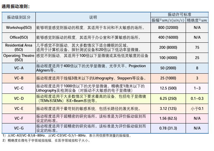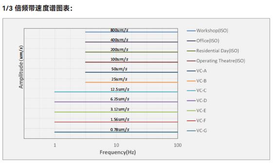 為了作出區(qū)分,人們進(jìn)行了很多的研究,并且發(fā)現(xiàn),根據(jù)頻率的不同,設(shè)備所作出的位移響應(yīng)雖然不同,然而速度響應(yīng)幾乎是相同的。因此,為了規(guī)定各種活動(dòng)以及對(duì)于設(shè)備所允許的振動(dòng)級(jí)標(biāo)準(zhǔn),通常使用 1/3 倍頻帶速度譜。這一標(biāo)準(zhǔn)曲線的優(yōu)點(diǎn)是能夠表示用速度的有效值來表達(dá)出振動(dòng),而非用位移或加速度來表達(dá),以及如果設(shè)備種類相同,性能開始受影響的速度值也基本相似。