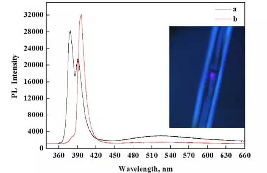 作為第三代半導體材料的典型代表,GaN藍光材料一直是近年來研究的熱點。ZnO和GaN同為穩(wěn)定的六角纖鋅礦結構,室溫下的禁帶寬度為3.37eV,激子束縛能高達60meV,即使在室溫甚至高于室溫下也能實現(xiàn)高效的激子發(fā)射。因而,ZnO成為制備紫外發(fā)光器件(LEDs)、紫外激光器(LDs)等短波長光發(fā)射器件的主要候選材料。圖2和圖3為不同條件下制備的ZnO微米管的PL光譜,測試儀器采用北京卓立漢光自主研發(fā)生產(chǎn)的Flex One“微光”系列顯微光致發(fā)光光譜儀,激發(fā)光源選用325nm HeCd激光器。