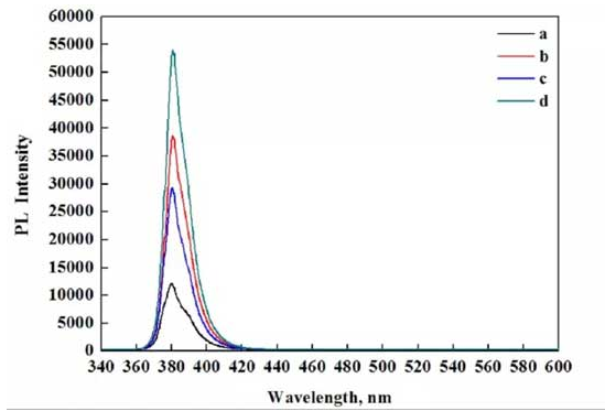 圖2中(a)為ZnO微米管中部的PL光譜,(b)為微米管斷口處的PL光譜;圖3為不同尺寸微米管的PL光譜(a<b<c<d)。ZnO在紫外區(qū)具有優(yōu)異的發(fā)光性能,近帶邊紫外發(fā)光特性的研究一直是人們關注的熱點。對于ZnO豐富的近帶邊發(fā)光,人們尚缺乏統(tǒng)一的認識。在380nm左右的紫外發(fā)射峰對應于ZnO的帶邊躍遷的自由激子復合;392nm左右的發(fā)射峰屬于帶間輻射躍遷的結果;450~650nm的可見光區(qū)域也有一強度很弱且寬的發(fā)射峰,該發(fā)射峰對應于ZnO的表面氧缺陷,PL峰強度越強,代表氧缺陷濃度越高[1, 2]。